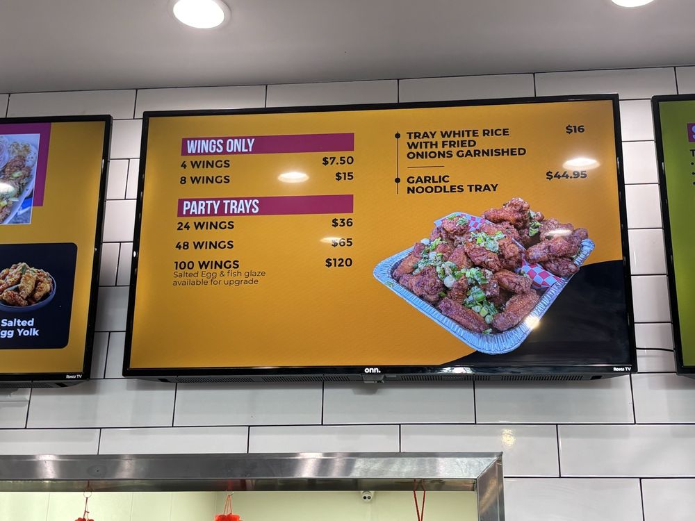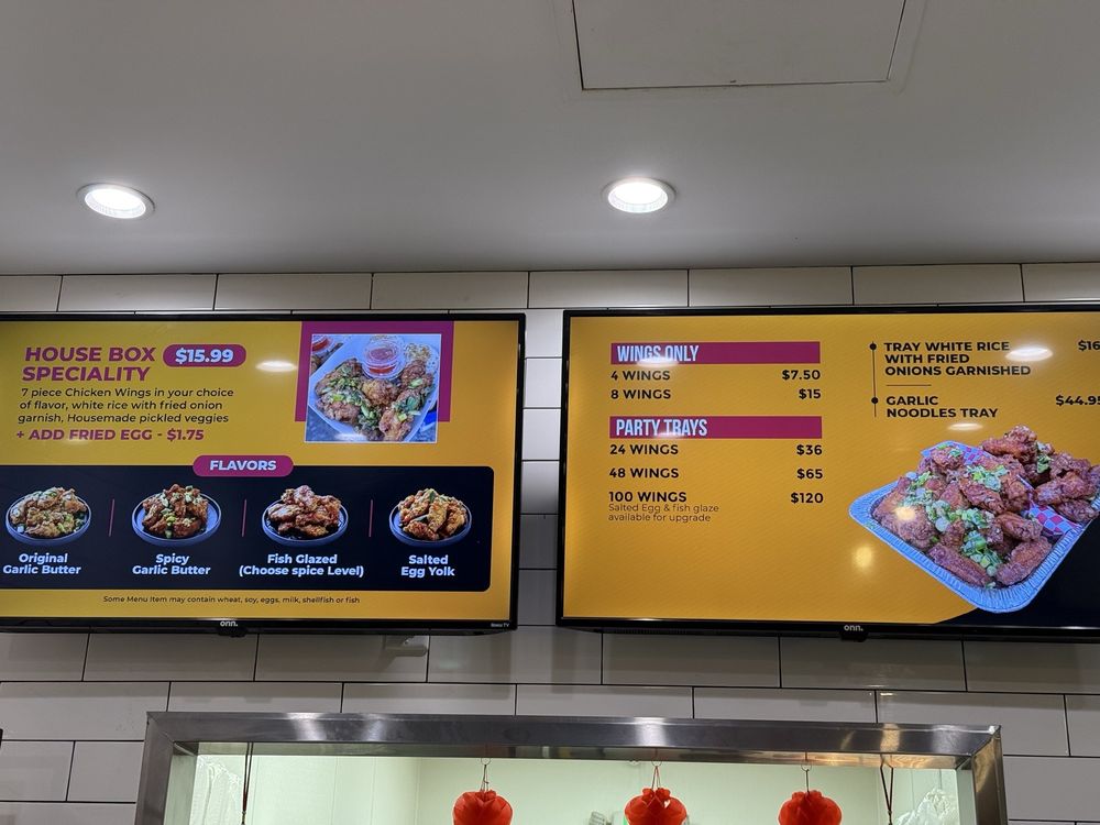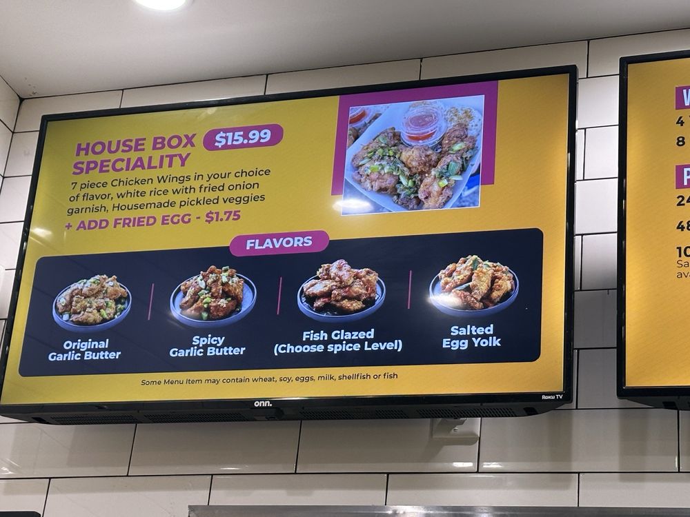 “ Friends recommendation of Vietnamese Fried Chicken Place after seeing an Instagram post. This place is located on Bolsa and Magnolia...across the street from 7-11 and right next to Carrot N' Diakon sandwich shop. Parking is limited so be warned during peak hours Inside is inviting and the record is like any typical sandwich shop with limited dining in seating. Menu is pretty simple of mainly wings and appetizers. There two rice options: $8 rice is 6 scoops while $2 rice is just one scoop. Soda is can. Have a dispensable water (hot/cold) dispenser. Wings comes in four different sauces: original/spicy garlic butter or $2 extra if want salted egg yolk or fish glazed. Fish glazed is mainly Vietnamese fish sauce and red Thai chilli peppers (according to cashier) Order the 24 wings platter for dine in. Can choose up to 2 sauces. Surprisingly it took less than 10 minutes. Wings looks beautiful and appetizing. Spicy garlic comes with garnished glazed green onions while salted egg yolk is heavily coated in special sauce. Taste is moist and not too dry. However, they don't offer complimentary sauce when ordering wings because you have to order separately of 50 cents each. Overall, recommend if wanting to try Vietnamese fried chicken. ”