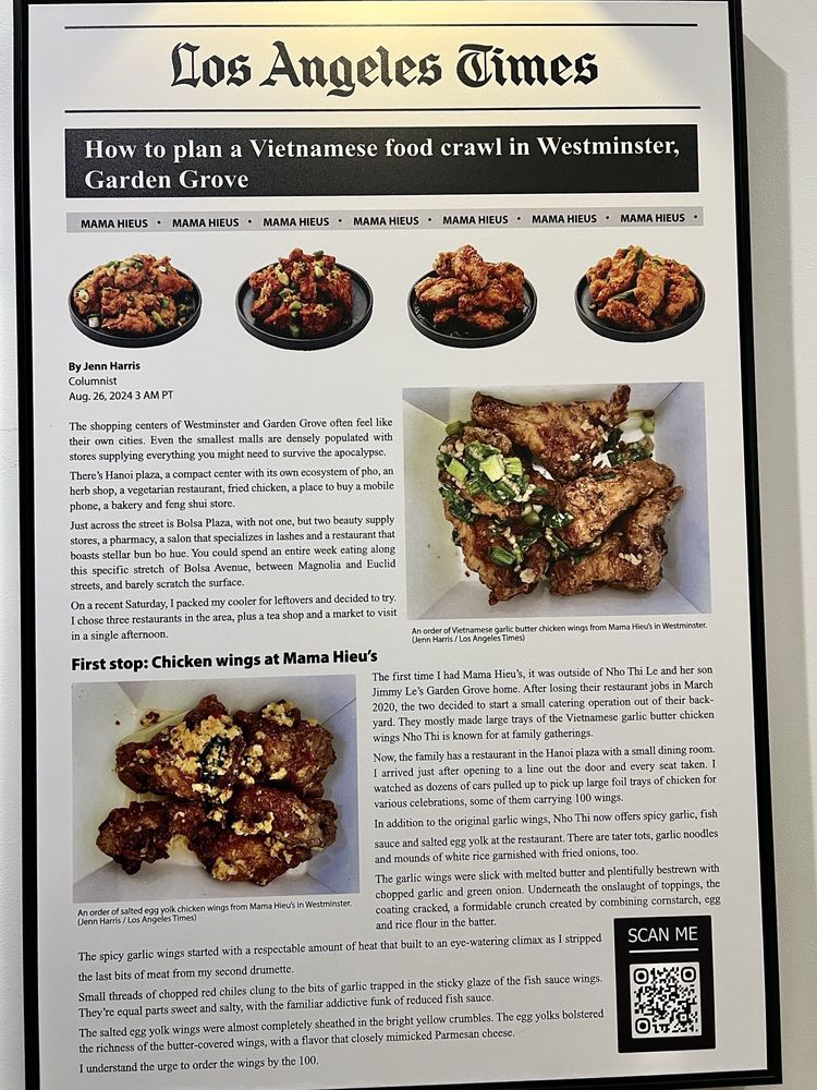 "Mama Hieu's" is a Vietnamese restaurant known for its crispy and flavorful chicken wings, offering various flavors like original garlic, spicy garlic, fish sauce glaze, and salted egg yolk. Customers rave about the juicy and tender chicken, with just the right amount of spice. The restaurant also serves other dishes like truffle parmesan tater tots and garlic noodles, complemented by friendly service and a cozy ambiance. Mama Hieu's commitment to supporting the community, such as aiding LA wildfire victims, adds to the overall positive experience. With a focus on delicious food, great service, and community involvement, Mama Hieu's is a must-try destination for Vietnamese cuisine lovers.